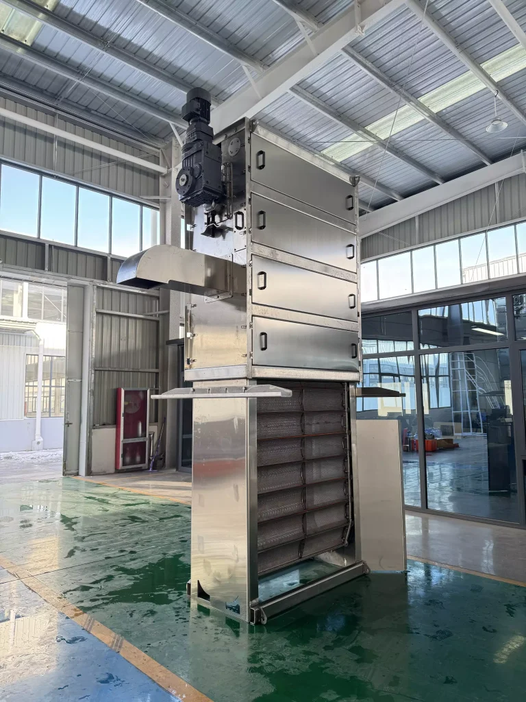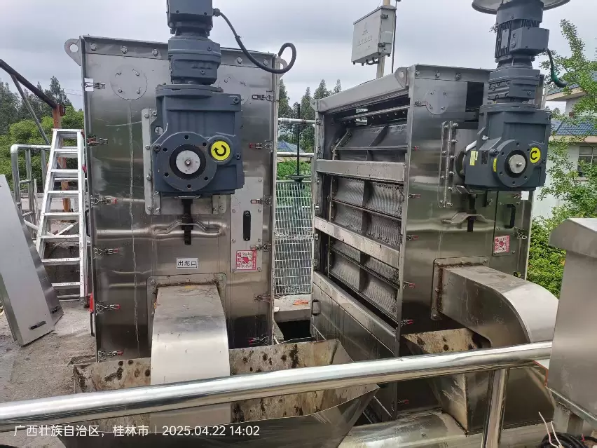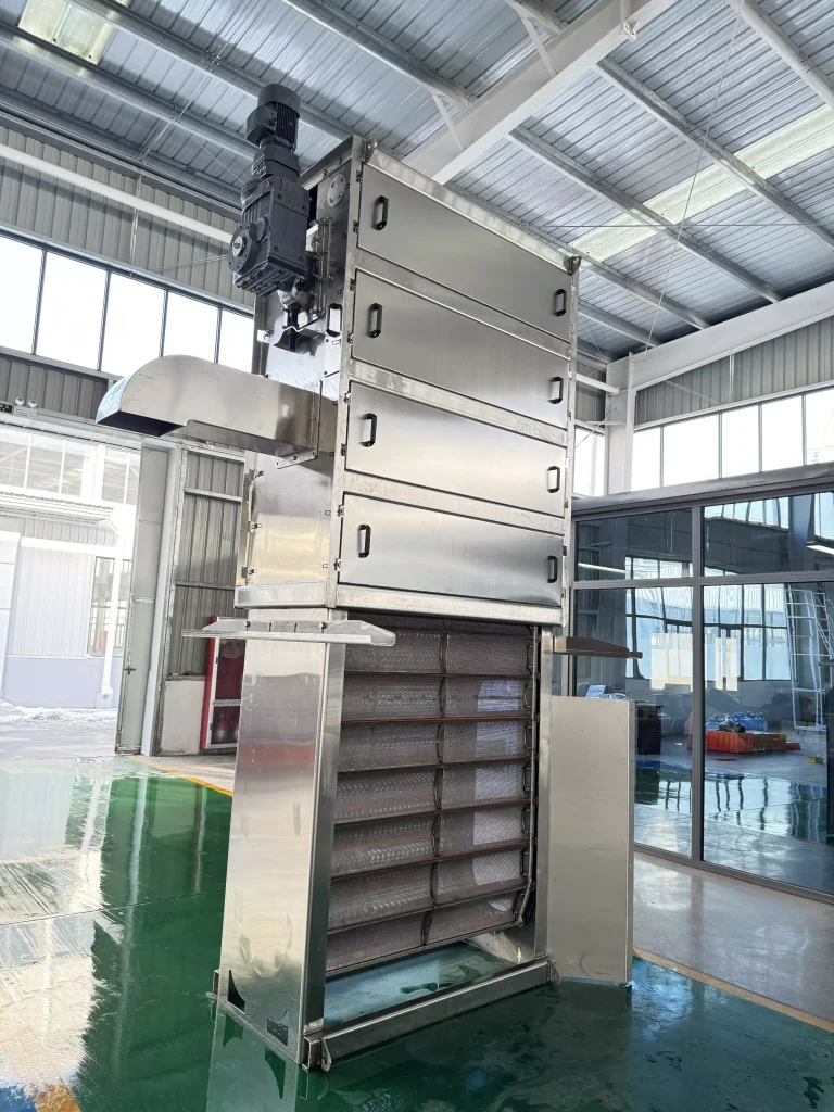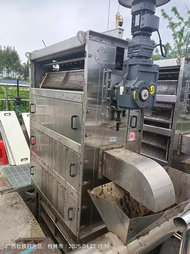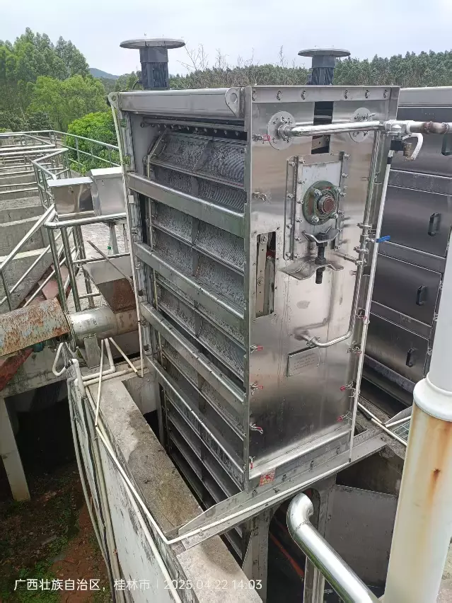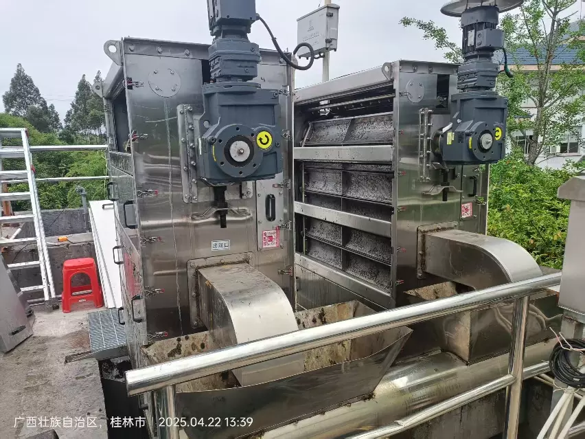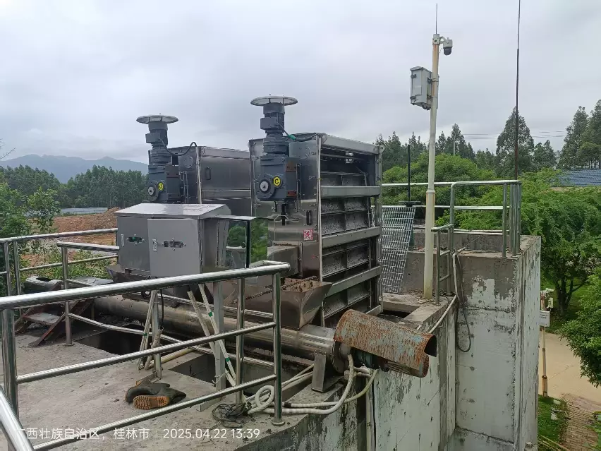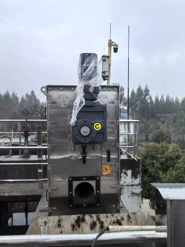 A geared motor drives a sprocket to rotate, which in turn drives the screen to rotate continuously. Wastewater enters the screen through the inlet, is filtered by the screen, and then flows outwards towards the outside of the screen. Debris is trapped on the inner surface of the screen and carried to the top as the screen rotates. The backwashing system washes the outside of the screen, and under the action of the backwash water, the debris is washed into the slag collection tank and flows out of the discharge port along with the backwash water.