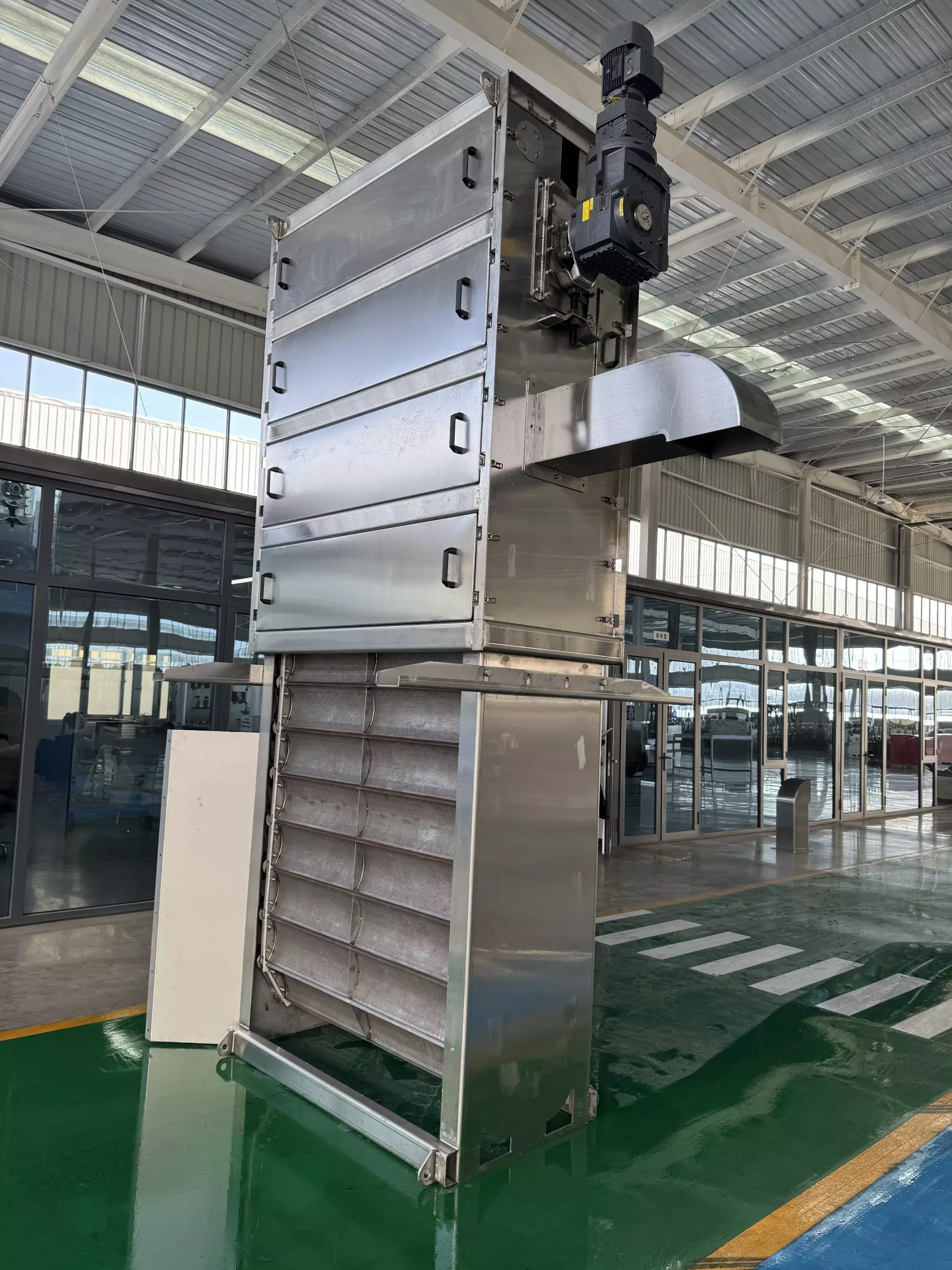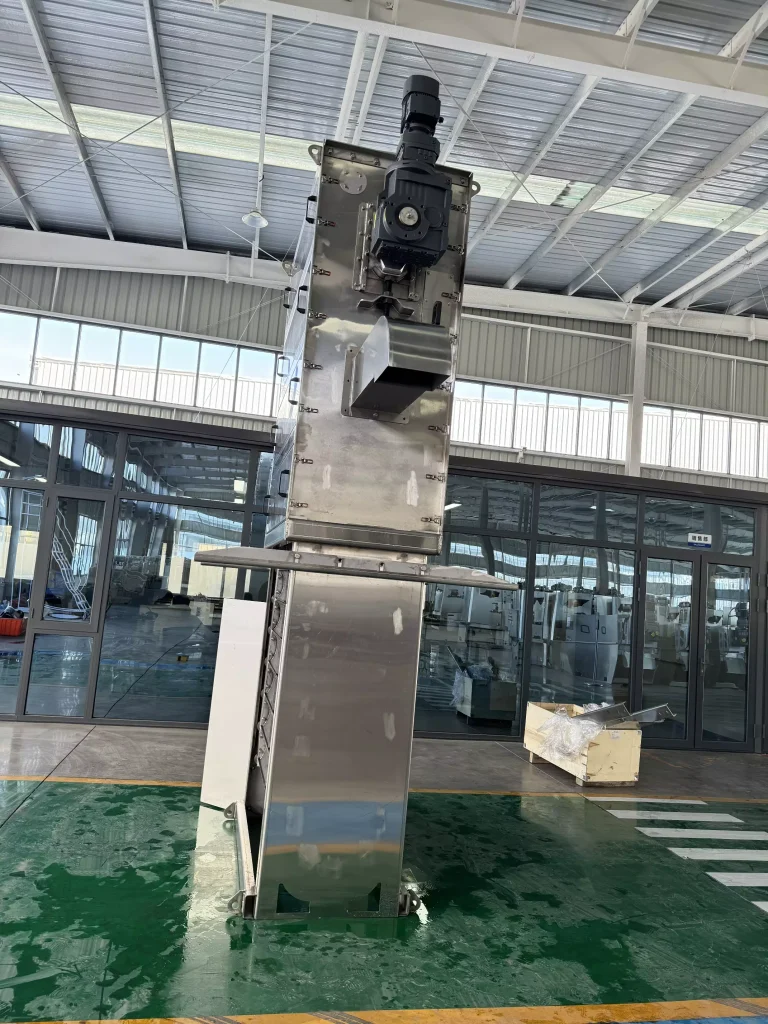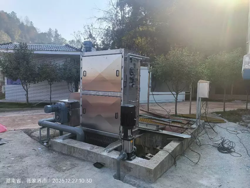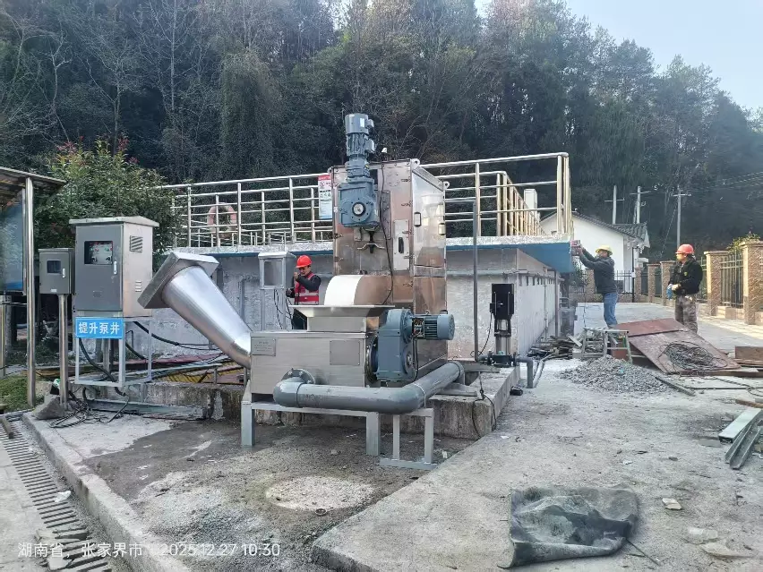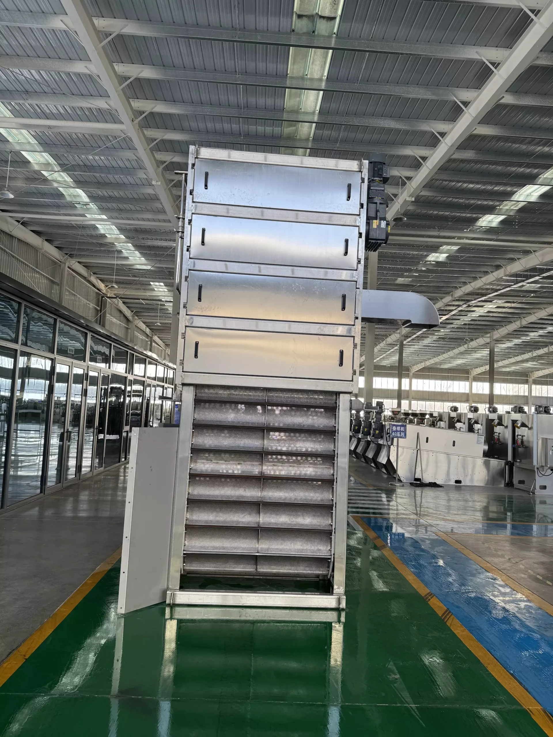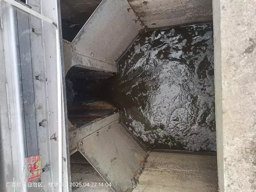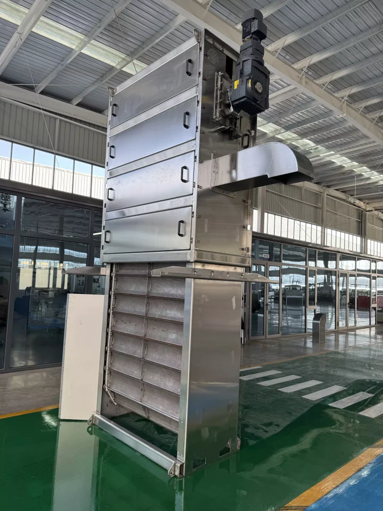 A geared motor drives a sprocket to rotate, which in turn drives the screen to rotate continuously. Wastewater enters the screen through the inlet, is filtered by the screen, and then flows outwards towards the outside of the screen. Debris is trapped on the inner surface of the screen and carried to the top as the screen rotates. The backwashing system washes the outside of the screen, and under the action of the backwash water, the debris is washed into the slag collection tank and flows out of the discharge port along with the backwash water.
