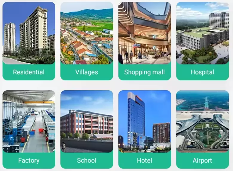 Widely used in residential communities, villages and towns, office buildings, shopping malls, hotels, sanatoriums, hospitals,schools, airports, new rural areas, highways, factories, touristattractions, etc.