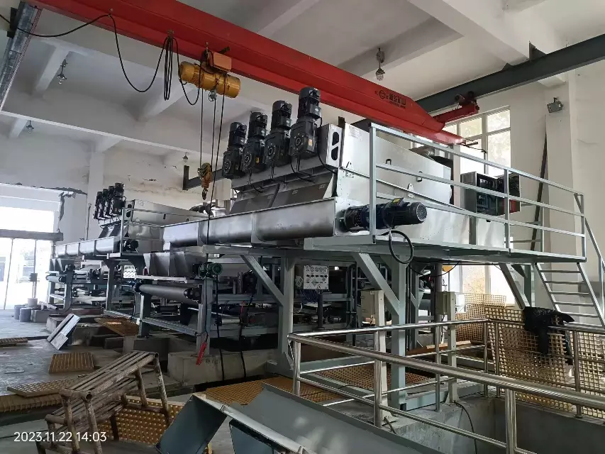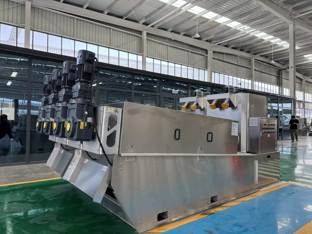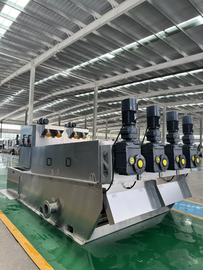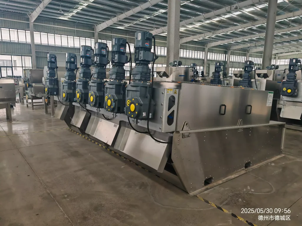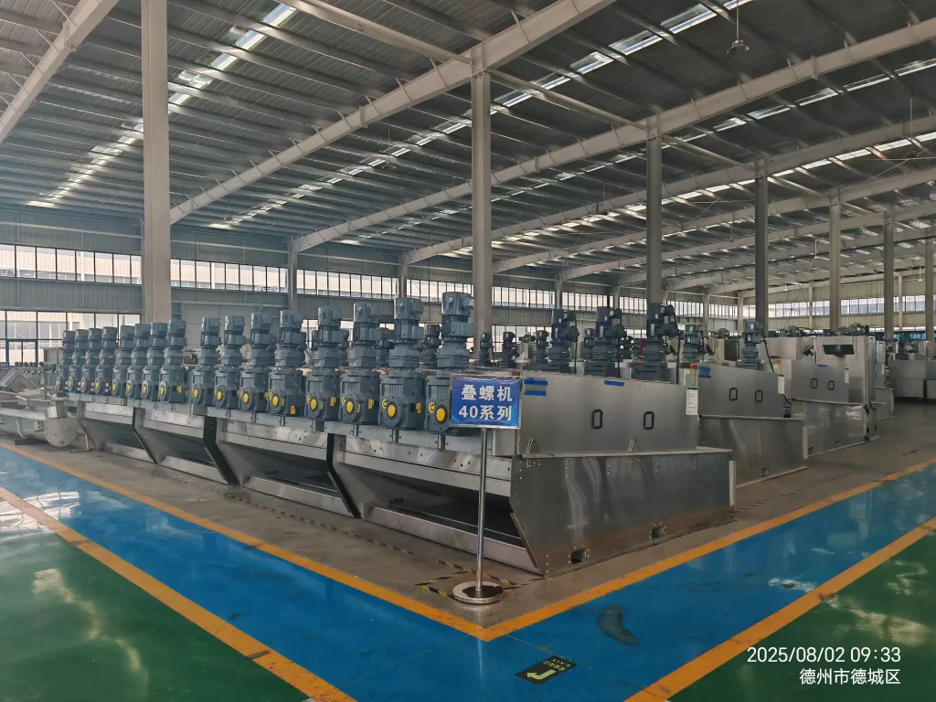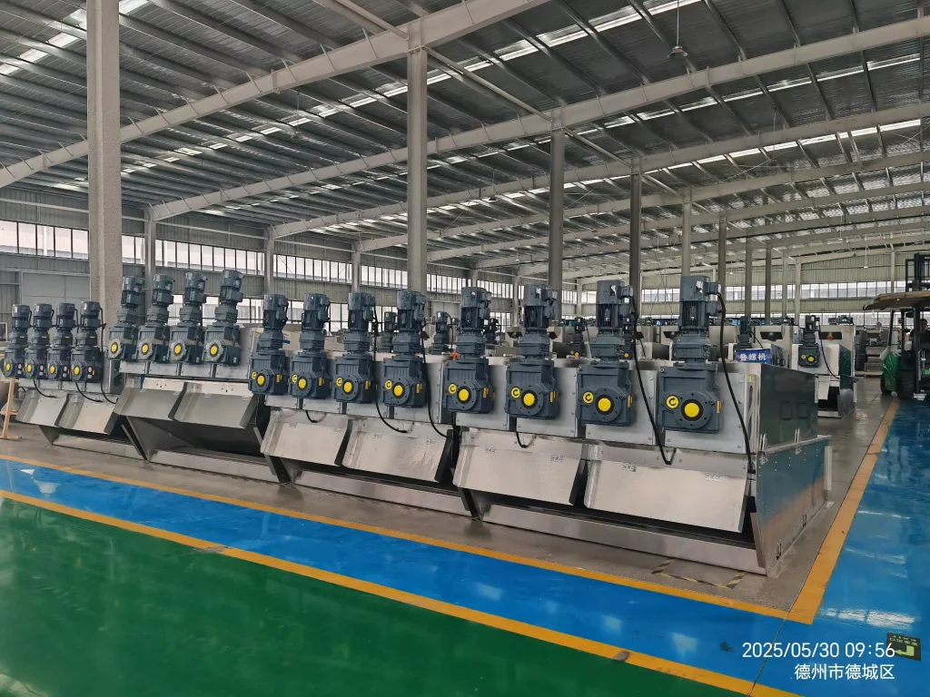 During operation, sludge enters the filter cartridge from the feed port and is propelled towards the discharge port by the rotating screw shaft. As the pitch between the screw shaft’s rotations gradually decreases, the pressure on the sludge continuously increases, and dewatering begins under the pressure difference. Water flows out through the filtration gap between the fixed and movable rings. Simultaneously, the equipment utilizes the self-cleaning function between the fixed and movable plates to clean the filtration gaps and prevent clogging. After thorough dewatering, the sludge cake is discharged from the discharge port under the propulsion of the screw shaft. Our company has developed targeted machines based on different sludge properties, resulting in more practical structures and lower operating costs.