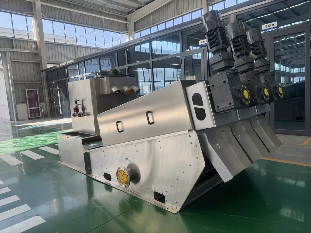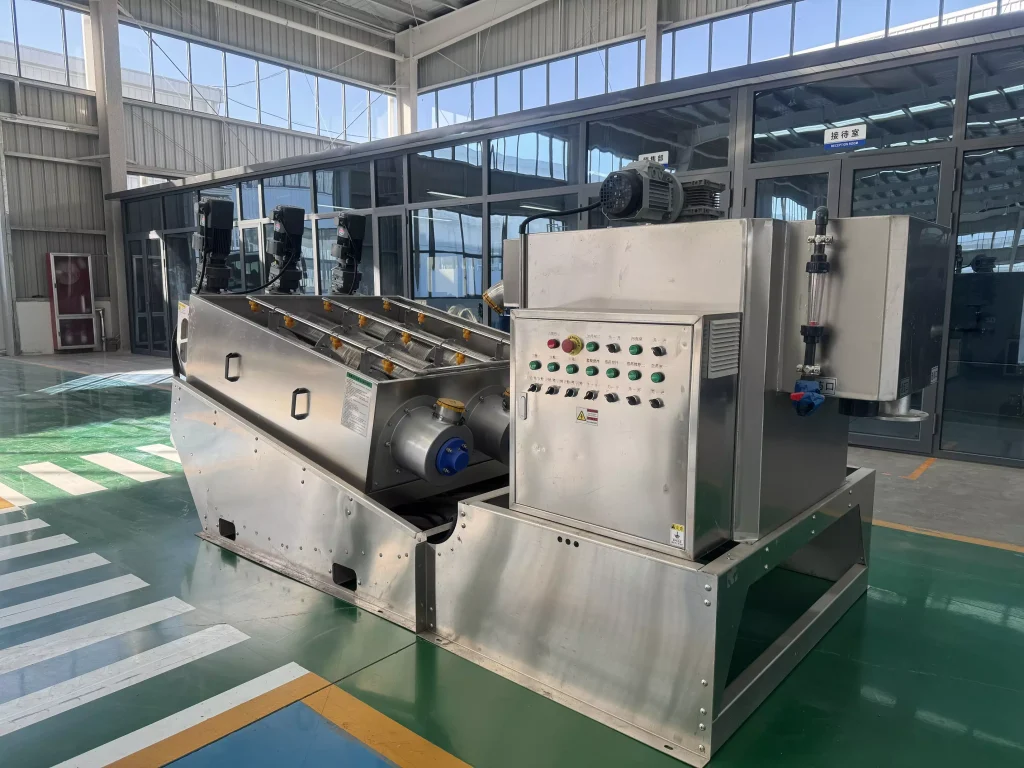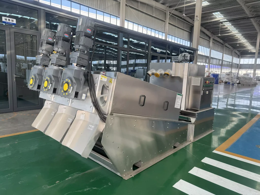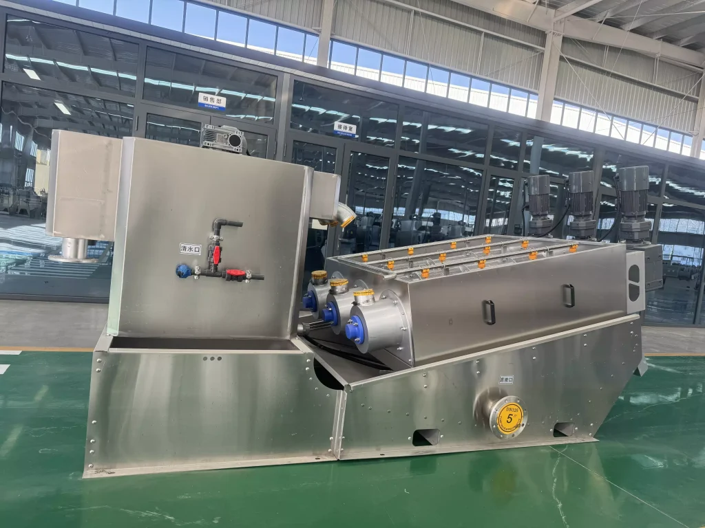 During operation, sludge enters the filter cartridge from the feed port and is propelled towards the discharge port by the rotating screw shaft. As the pitch between the screw shaft’s rotations gradually decreases, the pressure on the sludge continuously increases, and dewatering begins under the pressure difference. Water flows out through the filtration gap between the fixed and movable rings. Simultaneously, the equipment utilizes the self-cleaning function between the fixed and movable plates to clean the filtration gaps and prevent clogging. After thorough dewatering, the sludge cake is discharged from the discharge port under the propulsion of the screw shaft. Our company has developed targeted machines based on different sludge properties, resulting in more practical structures and lower operating costs.
