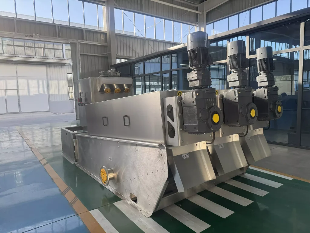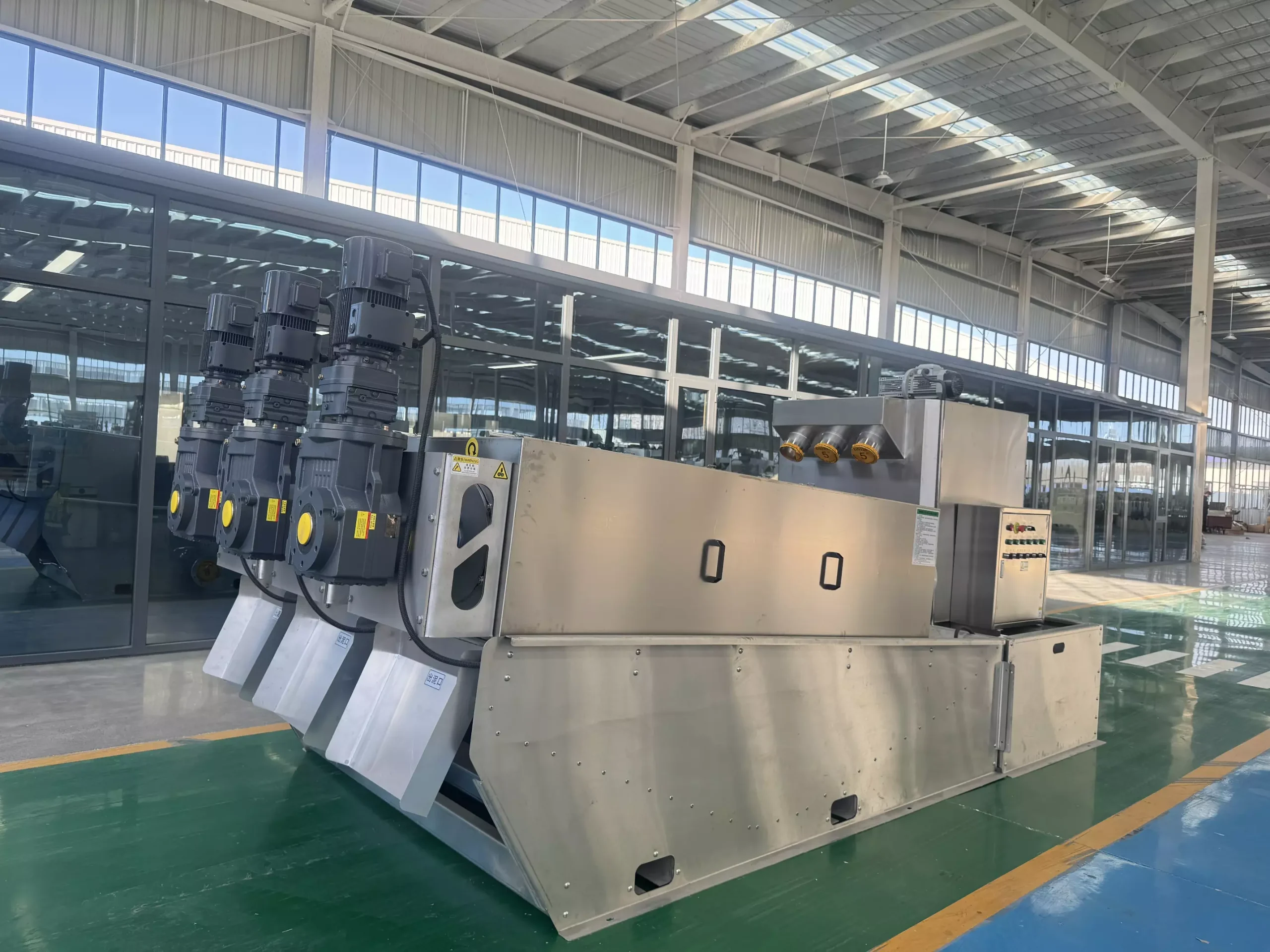 During operation, sludge enters the filter cartridge from the feed port and is propelled towards the discharge port by the rotating screw shaft. As the pitch between the screw shaft’s rotations gradually decreases, the pressure on the sludge continuously increases, and dewatering begins under the pressure difference. Water flows out through the filtration gap between the fixed and movable rings. Simultaneously, the equipment utilizes the self-cleaning function between the fixed and movable plates to clean the filtration gaps and prevent clogging. After thorough dewatering, the sludge cake is discharged from the discharge port under the propulsion of the screw shaft. Our company has developed targeted machines based on different sludge properties, resulting in more practical structures and lower operating costs.